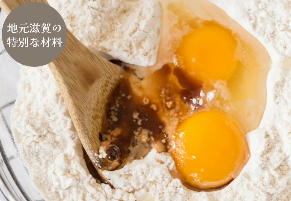 地元滋賀の特別な材料を取り入れ、国産の有機小麦粉やてんさい糖、有機食品を使って丁寧に製造しています。